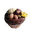 Dit chocolade mandje bevat ambachtelijk gevulde eitjes en massieve eitjes. Voor ieder wat wils. De chocolade mand komt in een luxe transparante geschenkdoos en dient te worden opgehaald in onze winkel, omdat deze erg breekbaar is.