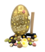 Dit grote paasei zit vol verassingen. Benieuwd? Maak de ei dan open met de hamer en ontdek wat voor lekkers er allemaal in het ei zit. Het product wordt verpakt in een luxe transparante verpakking en kan alleen worden opgehaald in de winkel, omdat deze erg breekbaar is.