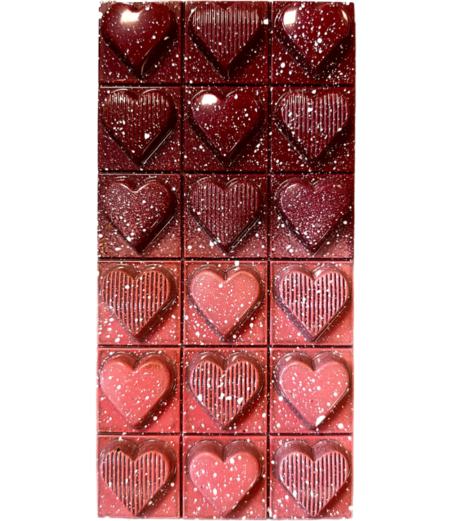 Valentijn chocolade reep met harten. De reep is gevuld met huisgemaakte hazelnoot praline vulling.